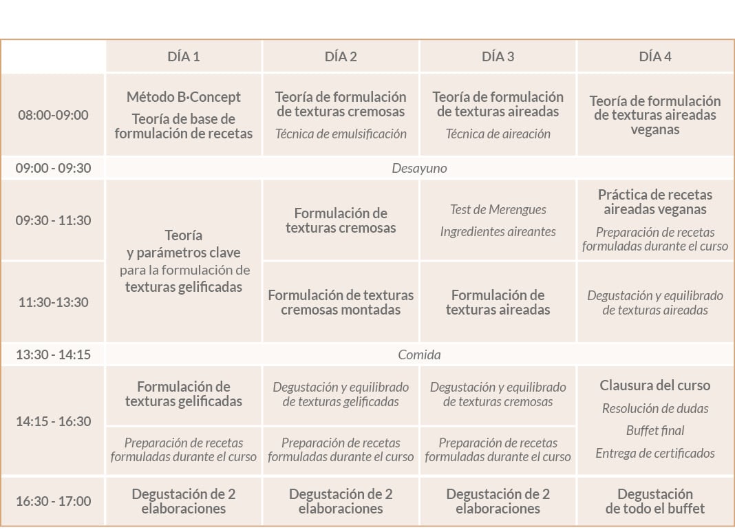 En esta tabla puedes ver lo que realizarás en el curso día a día. Ten en cuenta que puede variar ligeramente, dependiendo de las necesidades del grupo o de los ingredientes que estén disponibles en el momento de la realización del curso.