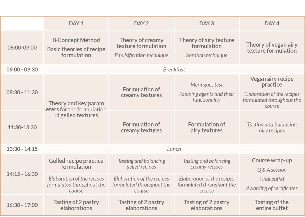 You will acquire all this theoretical knowledge starting with an online section that you can complete on your own a month before the course begins. Then, during the course, you will work in teams to expand your knowledge, put what you have learned into practice, and create more than 30 recipes. Finally, you will enjoy a full buffet of different pastry creations pastry using the B·Concept method.