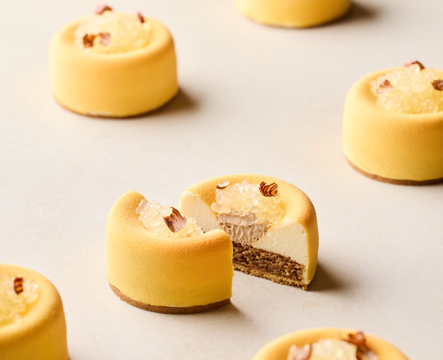 Super fresh, slightly sour and subtly sweet - that's how we'd describe our Grecia entremets. We've paired the best Greek yogurt with different blueberry textures: a glaze, a mouse, and a compote. This all falls upon a base of noisette butter crunchy.
